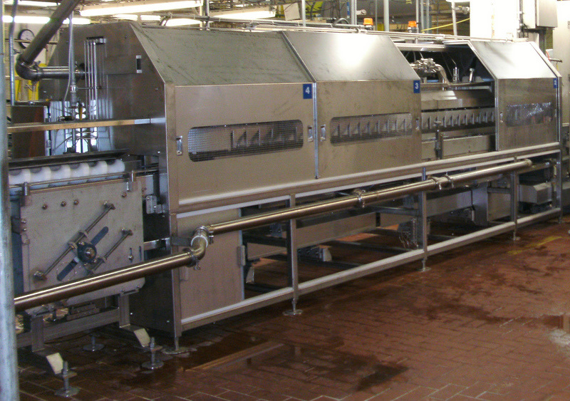 Chill tanks consist of a small open tank that has cool water circulating through it and a belt conveyor to carry the product out. Sealed product that may have been previously heated is loaded into the tank to cool and then conveyed out to the next process.